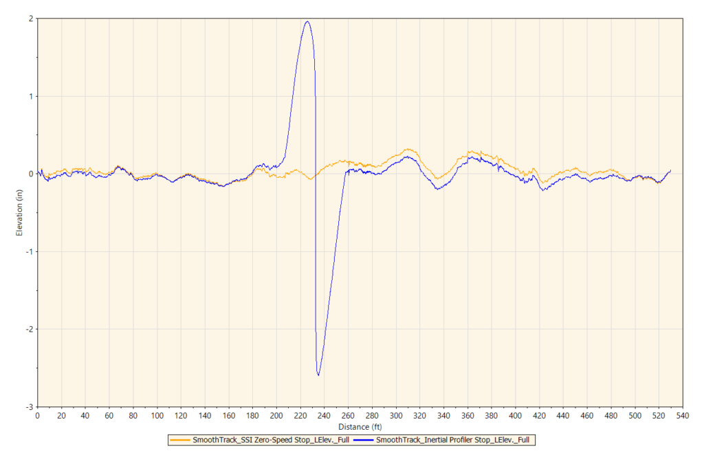Below is the error that occurs when a traditional inertial profiler comes to a stop compared to the SSI Zero-Speed profiler. These two profiles have an IRI difference over 300%. This highlights the importance of Zero-Speed systems in urban and trafficked areas.