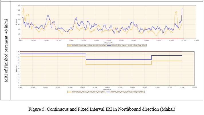 Collecting smoothness information and sharing the data with the paving crew resulted in helping the paving crew adjust their paving operation based on their previous actions and procedures. Seeing the MRI numbers track in the expected direction also uplifted everyone’s morale. The MRI value of 48 in/mi and 46 in/mi in Makai and Mauka lanes, respectively, was under the project specification of 60 in/mi and amounts to an overall percentage improvement of over 78% for the project.