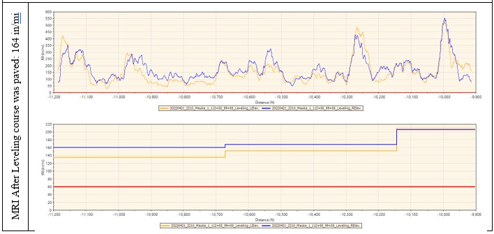 Without the leveling course, milling model, quality control, and proper planning for the stages of improvement, the specification’s MRI threshold of 60 in/mile may not have been met. The decision to collect MRI data after every activity proved to be valuable, as it provided important information to quality control department and the paving crew in making adjustments to the mix, paving and rolling operation. All these factors led to the project’s success.